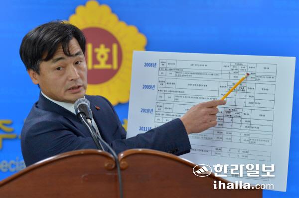 | 김우남 더불어민주당 제주도지사 선거 예비후보측 고유기 대변인이 14일 기자회견을 열어 같은 당 문대림 예비후보의 '유리의 성' 주식 등에 대한 의혹을 제기하자 문 예비후보가 반박 기자회견을 여는 등 후보들간 공방이 가열되고 있다. 강경민기자 |