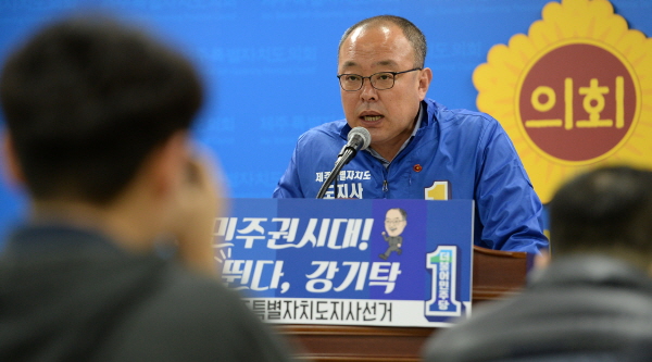 강 예비후보는 19일 제주도의회 도민의 방에서 기자회견을 열어 "'제주적폐 청산 동참 선언, 제주도의 미래비전과 정책 관련 상호토론회 개최, 더불어민주당 중앙당 공직선거후보자추천관리위원회에 면밀하고도 책임 있는 검증 요청과 자료 성실 제출 및 소명 약속'을 논의하기 위한 더불어민주당 제주특별자치도지사 선거 예비후보 4자 회담을 제안한다"고 밝혔다.