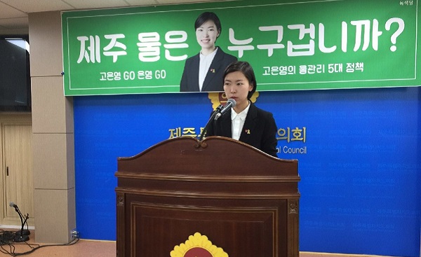 고은영 제주녹색당 제주도지사 선거 예비후보는 11일 오전 제주도의회 도민의 방에서 기자회견을 열고 '제주 물 관리 5대 정책'을 발표했다.