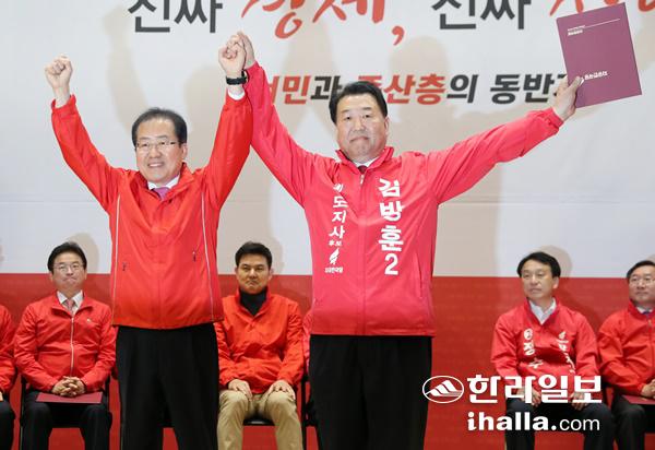 자유한국당 홍준표 대표가 12일 오전 국회 의원회관 대회의실에서 열린 6·13 지방선거 후보자 출정식에서 공천장을 받은 김방훈 제주도지사 후보와 기념촬영을 하고 있다. 연합뉴스