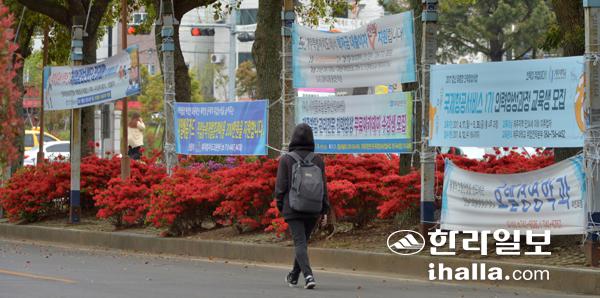 한 학생이 한라대학교 교내에 걸린 각종 취업관련 정보가 적힌 현수막 옆을 지나고 있다. 강경민 기자