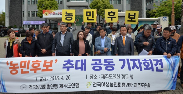 전국농민회총연맹 제주도연맹과 전국여성농민회총연합 제주도연합은 26일 제주도의회 정문 앞에서 기자회견을 열어 "두 예비후보를 농민 후보로 추대하기로 결정했다"면서 이 같이 밝혔다.