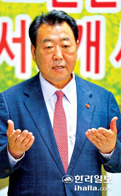 ▶제주 농가부채 해결방안은=제주 농가당 평균부채가 6500만원을 넘어서 전국평균 2.4배에 달하고 있다. 문재인 정부의 제주8대공약 중에 중요공약의 하나인 해상운송비 국비지원이 있음에도 불구하고 국회를 통과한 예산안이 집행되지 못하는 것은 제주를 무시한 처사다. 제주특별법'제 269조 해상운송비 지원특례규정이 시행되고 있음에도 불구하고 1년 해상운송비 지원은 시범사업으로 겨우 5억원 정도밖에 지원되지 않는 현실은 반드시 극복돼야 한다. 농업인 월급제 등이 추진되고 있으나 농사는 하늘이 절반을 짓는다는 말처럼 확실하지 못하다. 농산물 직불제의 확대 지원도 필요하다.