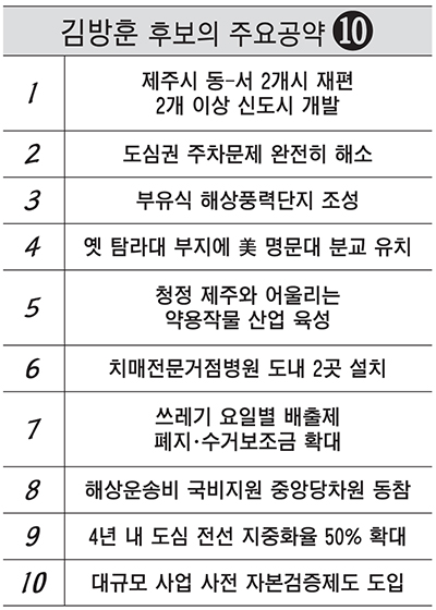 ▶제주도 행정체제를 개편할 의향은=제주시를 동-서 2개시로 재편하고 서귀포시의 읍면지역 발전을 위해 신공항 인접지를 포함 2개 이상의 신도시를 개발하겠다. 이 신도시는 관광과 상업, 교육, 문화, 주거 복합신도시가 될 것이다. 신도시 개발을 통해 막대한 개발이익이 생기게 될 것이며, 이 개발 이익은 도민 일자리와 복지에 쓰일 것이다.