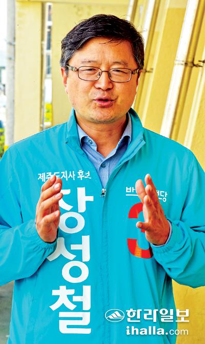 ▷ 도지사 출마의 변=국가정책학 공부, 시민운동, 기업경영, 공직경험 등을 통해 얻어진 문제 해결 중심의 '실용과 개혁의 리더십'을 바탕으로 '극심한 소득불균형의 위기'를 극복하는 데 온 몸을 던져서 일하겠다. 지금의 극심한 소득불균형의 위기는 불공정한 기득권 정치세력과 관료사회에 있다. 전 우근민 지사가 문대림 후보를 지원하고 있는 데 대해 불공정 기득권 정치의 연장이라는 측면에서 깊은 우려를 하고 있다. 패거리 기득권 구태정치를 몰아내고, 관료사회의 혁신이 이뤄지도록 해야 한다. 기득권 구태정치와 경직된 관료문화와 타협해 본 적 없는 저 장성철이가 앞장서겠다.
