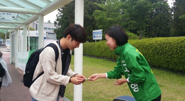 녹색당 고은영 제주도지사 예비후보는 2일 제주대학교를 방문해 학생들을 상대로 유세 활동을 전개했다.