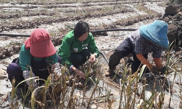 제주녹색당 고은영 제주도지사 선거 예비후보는 10일 안덕면을 방문해 마늘 생산지를 둘러보고 농업인의 고충을 듣는 시간을 가졌다. 사진=고은영 예비후보 선거사무소 제공