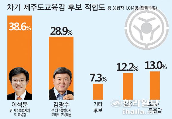 한라일보와 미디어제주·시사제주·제주투데이·헤드라인제주가 (주)리얼미터에 의뢰해 지난 15~16일 전화면접으로 도내 거주 19세 이상 성인 남녀 1014명을 대상으로 여론조사를 실시한 결과 차기 제주도교육감 후보 적합도에서 이석문 예비후보가 38.6%로 28.9%를 기록한 김광수 예비후보를 오차범위 밖인 9.7%p 앞섰다. 기타 후보는 7.3%, 부동층('없음' 12.2%, '모름/무응답' 13%)은 25.2%였다.