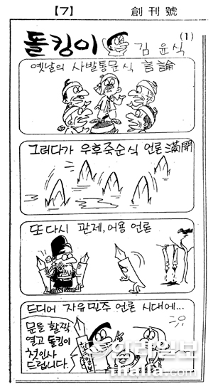 故 김윤식 화백도 네 컷 시사만화 '돌킹이'를 통해 '옛날의 사발통문식 言論, 그러다가 우후죽순식 언론滿開, 또다시 관제, 어용 언론, 드디어 자유민주 언론 시대에…(문을 활짝 열고 돌킹이 첫 인사 드립니다.)'라며 한라일보 창간이 갖는 의미를 새겼다.
