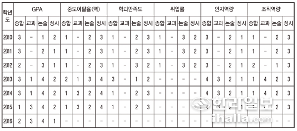 전략기획과 글로벌파워를 제외한 모든 영역에서 입학사정관전형 출신의 학생들이 가장 높은 역량을 보였다. 해당 보고서는 입학사정관 전형 출신의 학생들의 정규직 취업률이 가장 높은 이유를 이 학생들이 공통적으로 보이는 '조직역량'의 우수함이라고 평가했다.