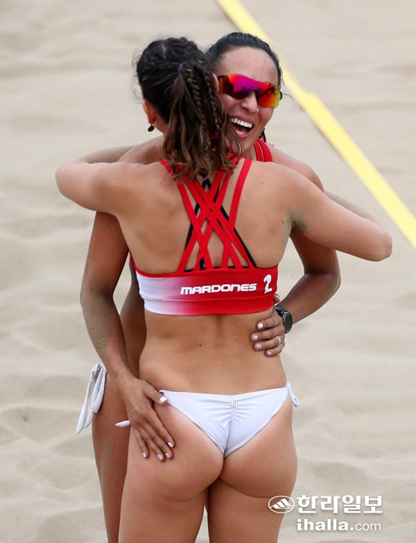 페루 리마에서 29일(현지시간) 열리고 있는 팬아메리카대회 비치발리볼 경기. 칠레팀이 코스타리카팀에 승리하자 기쁨을 나누고 있다.