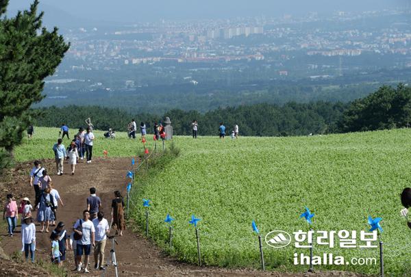 제주시 오라동 들판은 소금을 흩어뿌린 듯 촘촘히 박힌 하얀 메밀꽃으로 절경을 이루고 있다. 오라동 메밀밭은 30만평 규모로 전국에서 가장 넓어 이맘때만 되면 인생 사진을 남기려는 관광객과 도민들로 인산인해를 이룬다.
