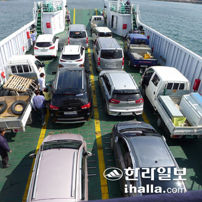 | 우도로 가는 도항선에 실린 10여대의 차량들. 이중 렌터카는 5대로 예전에 비해 크게 줄었다. |