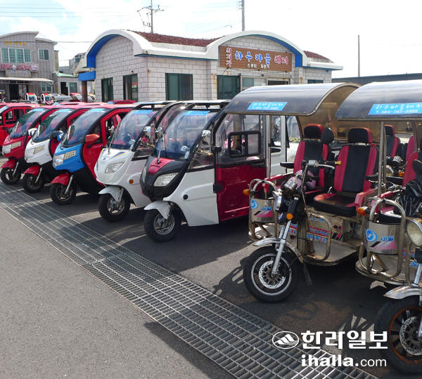 | 우도를 찾은 관광객이 주로 이용하는 삼륜 자동차. 외관이 특이하게 생겨 젊은층에게 인기가 높다고 한다. |