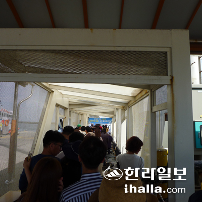 | 관광객들이 서귀포시 성산포항 종합여객터미널에서 우도로 가는 도항선을 타기 위해 줄지어 서 있다. 이상민기자 |
