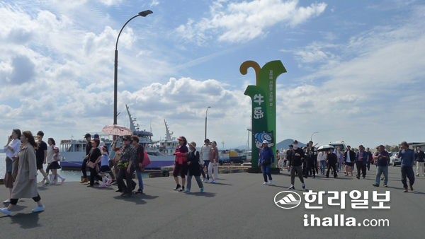 성산포항에서 출항한 도항선은 10여분 만에 천진항에 도착했다. 렌터카 수십 대가 일렬로 도항선에서 빠져 나가던 예전의 모습은 찾아볼 수 없다. 이날 차량 5~6대만 항구에 내렸다.