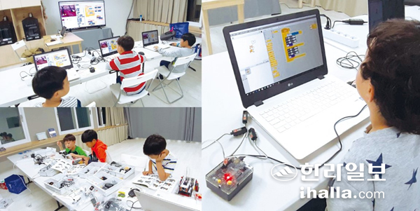 | 아동반이 로봇 코딩 수업을 받고 있다. 사진=유수암리상동마을회 제공 |