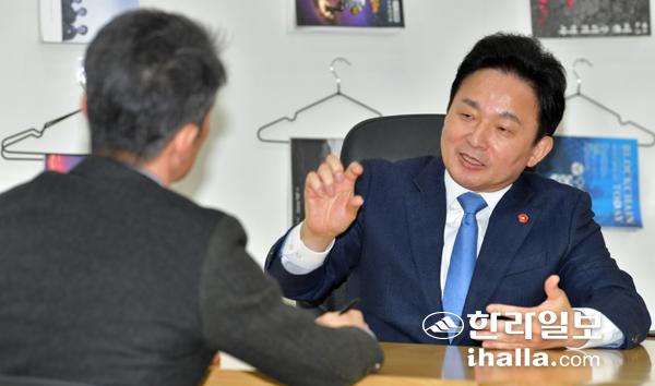 원희룡 제주특별자치도지사가 2020년 경자년(庚子年)을 앞두고 본보와 신년대담을 통해 새해 제주도정 방향과 제주 현안에 대한 의견을 밝히고 있다. 강희만 기자 photo@ihalla.com