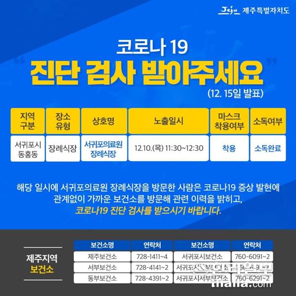 제주자치도는 지난 10일 오전 11시30분부터 오후 12시30분까지 서귀포시 동홍동 소재 서귀포의료원 장례식장을 방문한 도민과 관광객들에 대해 코로나19 진단검사를 받으라고 권고했다.