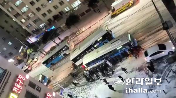 실제로 지난달 30일 저녁 제주시 이도2동 인근 도로에선 빙판길이 된 오르막길을 오르던 시내버스가 멈춰선 후 반대방향으로 밀려나면서 버스 승객과 인근에 있던 시민 등 10여명이 합세해 버스를 몸으로 떠받치는 다급한 상황이 전국적으로 알려져 안전성 논란이 제기됐다.