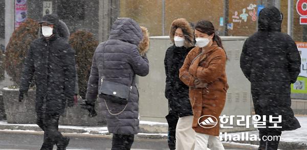 대설특보가 발효된 7일 오전 제주시내 도심에서 도민들이 힘겨운 출근길에 나서고 있다. 강희만기자