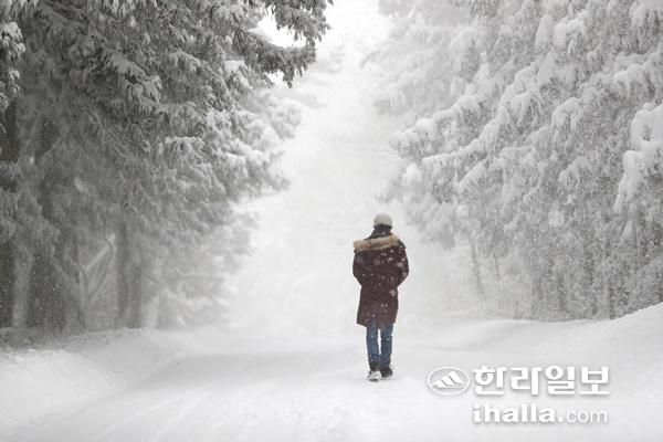 제주도에 이틀째 폭설이 내린 8일 오후 제주시 조천읍 사려니숲길에서 한 탐방객이 눈길을 걷고 있다.