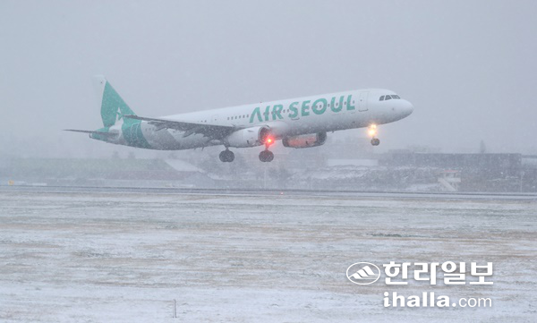 | 제주에 강풍과 폭설이 몰아친 18일 오전 에어서울 항공기가 제주국제공항 활주로에 착륙하고 있다. 연합뉴스 |
