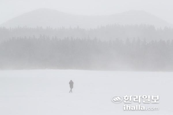 18일 오전 제주 서귀포시 표선면 중산간의 한 목장에 눈보라가 거세게 휘몰아치고 있다. 연합뉴스