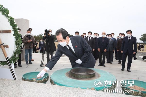 정세균 국무총리가 지난 16일 제주4·3 당시 억울하게 옥살이했던 수형인 335명이 70여 년 만에 전원 무죄를 선고받은 후 19일 오후 제주시 봉개동 제주4·3평화공원을 방문해 위령제단에 참배하고 있다. 이상국기자