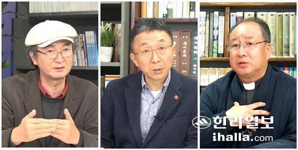 왼쪽부터 김수열 신축항쟁120주년 기념사업회 준비위원장, 박찬식 제주와미래연구원 연구위원장, 현요안 천주교제주교구청 사무처장.