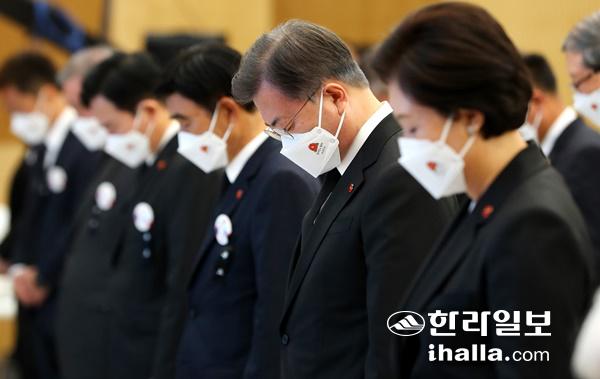 문재인 대통령이 3일 오전 제주 4·3 평화교육센터에서 열린 제73주년 제주 4·3 희생자 추념식에서 묵념하고 있다. 연합뉴스