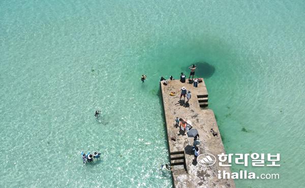 낮 최고기온이 30℃가까이 올라가며 초여름 날씨를 보인 7일 제주시 한경면 판포리 포구를 찾은 관광객이 스노클링을 즐기고 있다. 연합뉴스