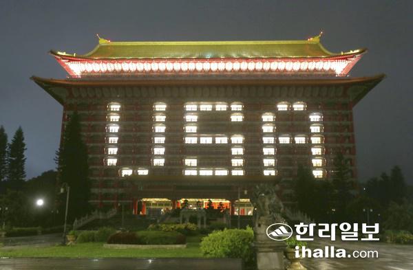 미국이 신종코로나바이러스감염증(코로나19) 백신 75만회분을 제공한 것에 감사하는 취지에서 대만 수도 타이베이의 그랜드 호텔(원산대반점) 외벽에 6일 객실 점등을 통해 'USA'라는 메시지가 연출되고 있다.