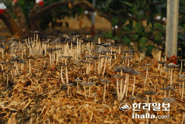 파쇄된 귤나무퇴비에 대량 발생한 소녀먹물버섯.