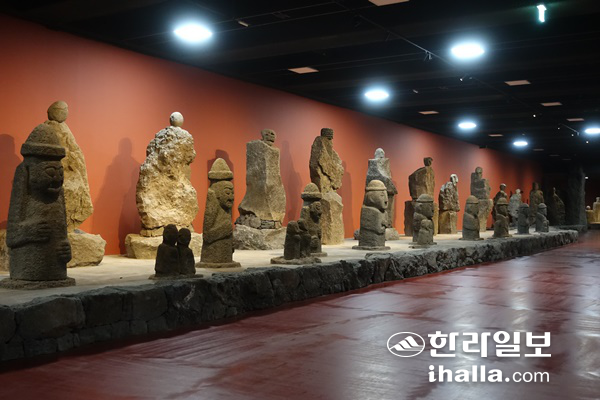 | 지하 '신화의 통로'에 놓인 재현 돌하르방, 동자석 등 석상들. |
