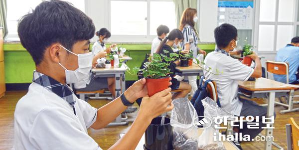 애월중학교 학생들이 교실을 숲으로 꾸미기 위해 꽃 화분을 만들고 있다. 이상국기자