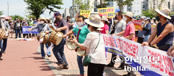 29일 제주상공회의소 앞에서 제주 제2공항 관련 집회를 갖고 있는 제2공항 추진연합 참여 주민들.