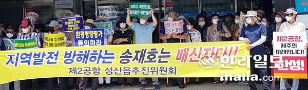 제주 제2공항 입지 예정지인 성산읍지역을 중심으로 한 6개읍면지역 주민들로 구성된 제주 제2공항 추진연합은 29일 제주상공회의소 앞에서 집회를 갖고 제주도민들을 기만하는 문재인 정부와 제주지역 송재호·오영훈·위성곤 국회의원을 강력하게 비판했다.