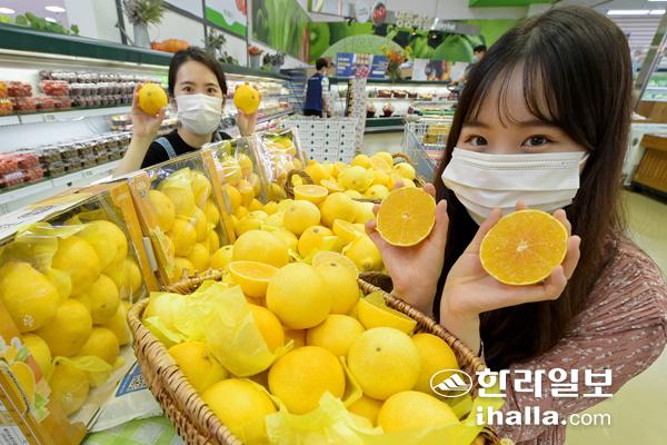 4일 서울 서초구 농협 하나로마트 양재점에서 모델들이 제주 서귀포 지역에서 올해 처음 출하된 '황금향'을 소개하고 있다.