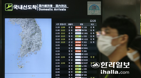 | 광복절 연휴(8월 14∼16일)가 시작된 14일 제주국제공항에 제주행 항공기들이 제주에 도착하고 있다. 제주는 연일 신종 코로나바이러스 감염증(코로나19) 최다 신규확진자가 나오면서 누적 확진자가 2천명을 넘어섰다. |