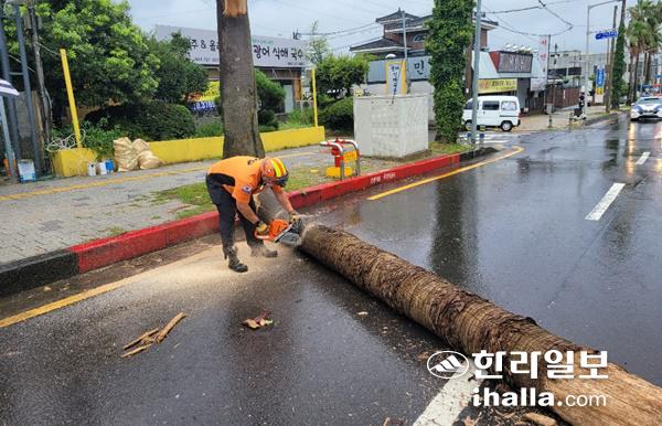 강풍주의보가 내려진 21일 오후 제주시 이도2동 한마음병원 인근 도로에 심어진 야자수가 강풍을 이기지 못하고 부러져 소방대원들이 안전조치를 하고 있다.
