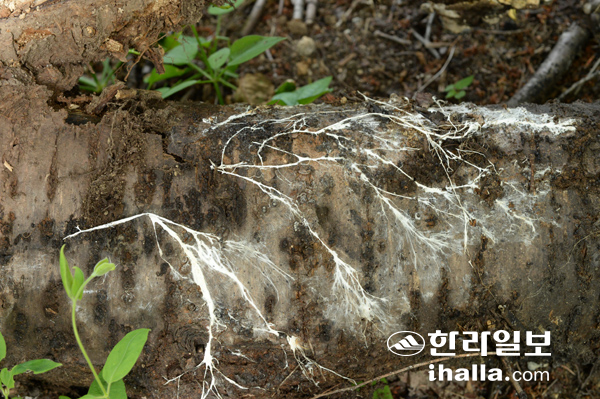 간버섯 균사체는 빨간색이나 백색부후균이다.