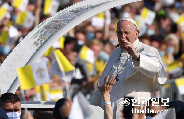 프란치스코 교황이 14일(현지시간) 슬로바키아 동부 프레쇼프에 도착해 신자 등 환영 인파를 향해 손을 흔들고 있다. 지난 7월 지병 수술을 받은 후 첫 해외 순방에 나선 교황은 헝가리에 이어 나흘 일정으로 슬로바키아를 방문 중이다.