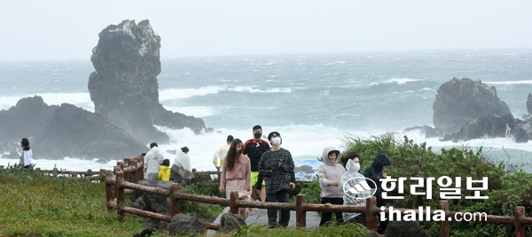 | 15일 서귀포시 섭지코지를 찾은 관광객들이 제14호 태풍 '찬투' 북상으로 강한 바람이 불자 서둘러서 발걸음을 옮기고 있다. 이상국 기자 |
