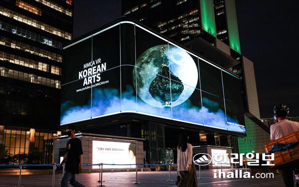 16일 오후 서울 강남구 삼성동 코엑스 케이팝스퀘어 전광판에 국립현대미술관(MMCA)이 마련한 가상현실(VR) 미술 한류 영상 시리즈 제1편 이수경의 '달빛 왕관-신라금관 그림자'가 나오고 있다.