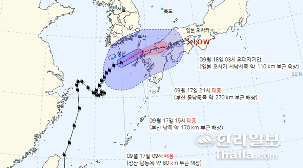 17일 오후 부산 남쪽으로 이동 후 온대저기압 약화