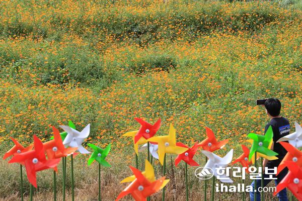 제주시 한림읍 금악오름 입구 황화 코스모스. 연합뉴스