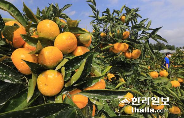 28일 오전 제주 서귀포시 남원읍의 한 과수원의 감귤이 주황색을 띠며 익어가고 있다.