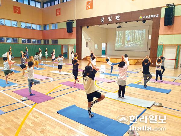 서광초등교 어린이들이 영상을 보며 요가 동작을 따라하고 있다.