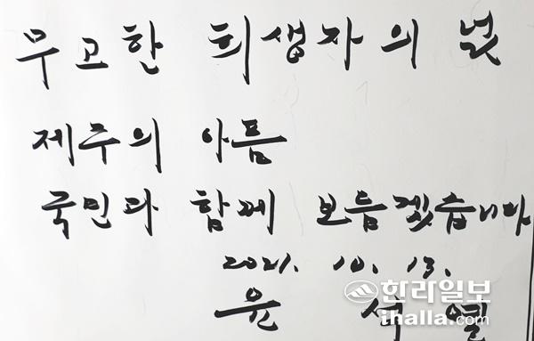 윤 후보는 참배후 방명록에 "무고한 희생자의 넋, 제주의 아픔 국민과 함께 보듬겠습니다"라는 글을 남겼다.